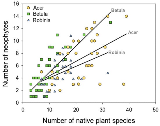 - Reinhart, K.O.; Greene, E.; Callaway, R.M. Effects of Acer platanoides invasion on understory plant communities and tree regeneration in the northern Rocky Mountains. Ecography 2005, 28, 573–582. [Google Scholar] [CrossRef]