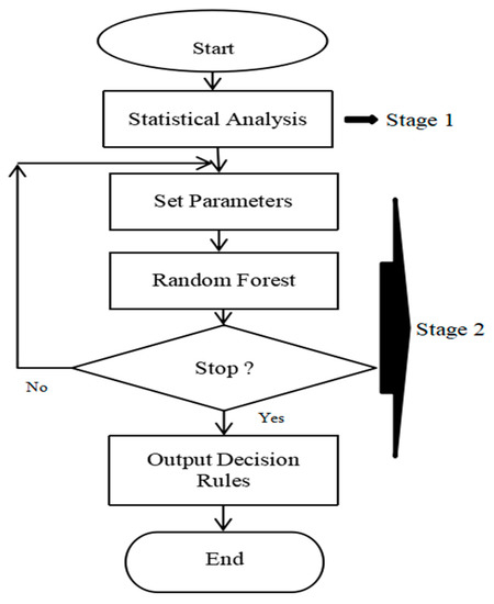 In stage 2, the random forest method is used to create decision rules to analyze whether the feelings of senior learners are variant from different backgrounds. First, we set parameters for random forest. The arbitrary forest is an ensemble knowing technique that constructs the best classifier using the majority of the decision tree classifier. Each decision tree classifier is sampled independently with equal distribution in the forest [13]. The steps of random forest are stated as follows [10,14]: