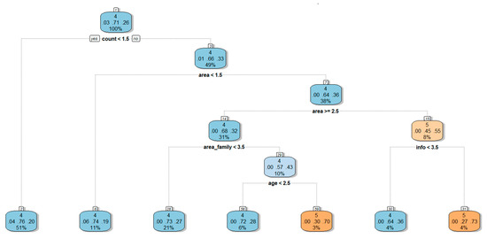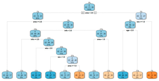 For random forest, the number of the decision tree classifier is set as 500. The decision tree is shown in Figure 2, Figure 3 and Figure 4. In Figure 2, there are four decision rules for social assistance. In Figure 3, there are seven decision rules for inspiration. There are 11 decision rules for learning fulfillment as shown in Figure 4.