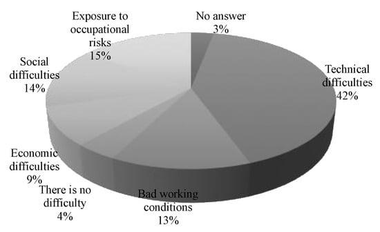 Colombia has informal recyclers in all cities, some of them have spent their entire lives in this field of work and have been a part of the culture of recycling on a daily basis. They have seen how this recycling activity in Colombia has changed over the years in society. Bogotá as a capital does not escape these issues, and with more than 8 million inhabitants, recycling processes are more complex. According to the survey applied, Figure 1 shows that the recyclers’ main difficulties, in order of importance are: technical difficulties, exposure to risks in their work, social difficulties, and poor working conditions; these results are similar to those found by other authors [7,37]. It is evident that technical difficulties are the most important for recyclers and these are associated with social difficulties and exposure to occupational hazards. This is because recyclers are seen by Colombian society as destitute, and thus not contributing to society. Another factor associated with this problem is that there are no selective waste collection routes in the city, which makes the activity of recyclers more complex. The culture of separation does not exist in the city and the lack of selective collection routes or incentive programs for recycling in homes influences the bad practices of separation that are associated with the three main difficulties found in the survey applied. This culture leads to recyclers being exposed to occupational hazards (Figure 1), because they usually always go behind a collection truck trying to recycle some of the garbage that is generated in their work zones, only recovering the recyclable waste which is 3% of the total waste generation by the city, a percentage similar to those found in Delhi, India, in which only 2% of the population recycle [38,39].