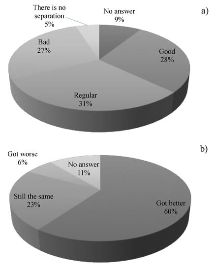 The separation at the source of waste plays an important role in the recycling of materials. When applying the survey, it was found that very few users perform good separation processes at the source (Figure 2a), leading to the recovery of many potentially usable materials being lost. It can be observed in Figure 2b that recyclers perceive a bad separation at the source of waste, but that the separation process has also improved. This improvement can be attributed to the environmental awareness of users and not to education processes by companies or the government itself. Currently, the government pays per ton disposed in the sanitary landfill and not by processes of exploitation and/or transformation. Figure 2 shows that although the recycler plays an important role in the value chain of solid waste, it is the consumers who do not do their part in the separation of waste. Likewise, collection routes, and housing and residential complexes are also not prepared for separation processes. This is because although there are storage rooms for waste in buildings and residential complexes, users do not take the task of separating, arguing that since there are no separation routes, all waste goes to the same site.