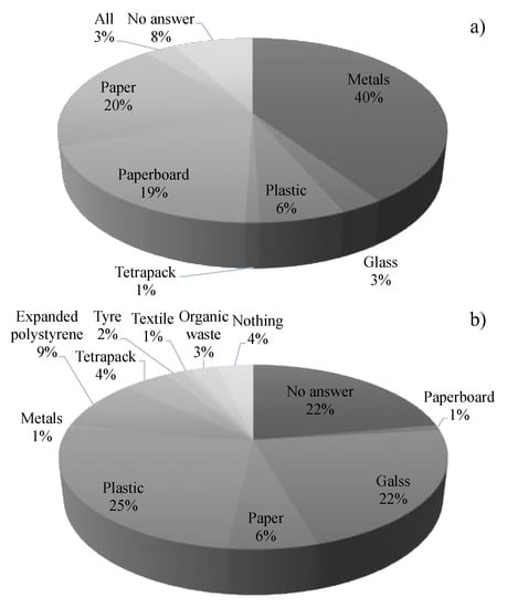 Figure 3 shows the percentages of sale of recovered materials. As can be observed in Figure 3a, among the best-selling materials, metals stand out. Other materials that are very well marketed are white paper and cardboard. These three materials have the best price in the market and therefore are the ones that recyclers seek to recover. The price of one kilogram of metal in the market is around 0.082 to 0.63 U.S. dollars depending on the type of material (aluminum, copper, scrap). Although recyclers try to look for this type of waste in garbage, they also try to recycle a large part of other materials, such as those shown in Figure 3b. Recyclers do not manage to sell them due to the conditions of the recovered material or because, for example, as with glass, the market for the purchase depends on the factories that receive the material, and this demand fluctuates over time.