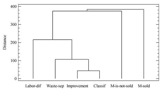 Figure 4 shows a cluster analysis of the variables considered important in the recycling process. It is observed that the improvement in separation and classification are associated in the first group and that they are the most important factors in the recycling process. Similarly, it can be seen that for a material to be sold or marketed depends significantly on the separation at the source. Therefore, the difficulties of the recycler are associated with the culture and education of separation at the source by the users of the sanitation service.