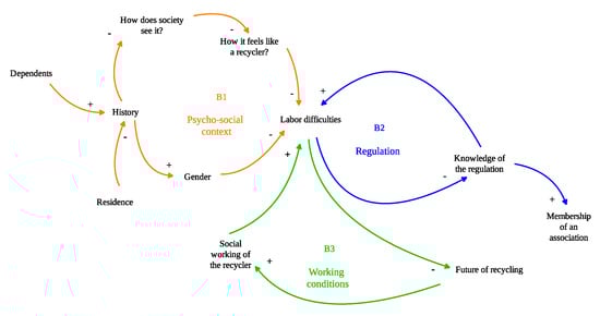 Figure 6 shows an interrelation between the three parameters from the categories of belonging to an association, difficulty of the work, how recyclers are seen by society, and recyclers’ perceptions of the value of their work. This shows that the experience and formalization process of the recycler includes several aspects of their psychosocial context, the conditions under which recycling is carried out in Bogotá, and the characteristics of the regulations. It is also observed that the gender variable is related to the difficulties in their work; for women, this work represents greater dangers and risks, including those linked to the preservation of their sexual integrity. This places them in a condition of greater vulnerability and marginalization.