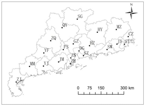Twenty one prefecture-level cities are located in Guangdong Province (Figure 1). They are Chaozhou (CZ), Dongguan (DG), Foshan (FS), Guangzhou (GZ), Heyuan (HY), Huizhou (HZ), Jiangmen (JM), Jieyang (JY), Maoming (MM), Meizhou (MZ), Qingyuan (QY), Shantou (ST), Shanwei (SW), Shaoguan (SG), Shenzhen (SZ), Yangjiang (YJ), Yunfu (YF), Zhanjiang (ZJ), Zhaoqing (ZQ), Zhongshan (ZS), and Zhuhai (ZH), respectively, where Guangzhou is the provincial capital and Shenzhen is a Special Economic Zone.