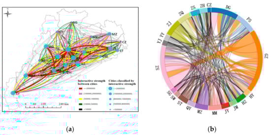 With the above cellular signal data, a weighted human mobility network is constructed, which is a fully connected directed network with 21 nodes and links. Let be the human mobility network, where is the node set (i.e., the set of prefecture-level city), is the link set (i.e., the connection between cities), be the link weight (i.e., human mobility volume from city i to j), if . Each directed link weight equals the average counting number of travel trips for one day. As shown in Figure 2, all cities in the study area are connected by human travels.