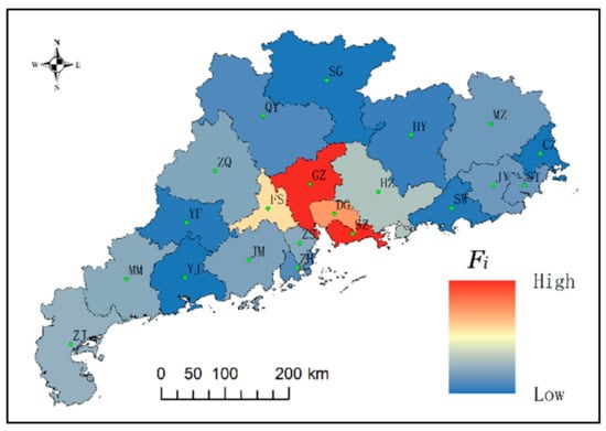 Let be the overall interaction strengths of city i with all other cities. implies a city’s aggregated attraction. Furthermore, the integrative attraction ratio is defined to describe the relative attraction of city i.