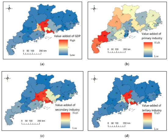 As different industries require different amounts of participants, the economic development is measured by total GDP, the primary, secondary, and tertiary industries, respectively, to amply understand the patterns of cities’ economic growths. The spatial distributions of value-added of total GDP, the primary, secondary, and tertiary industries are shown in Figure 4, respectively.