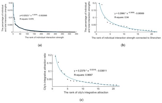 The rank order of link weights: (a) individual weights in the overall network, where satisfies ; (b) individual weights in partial network connected to Shenzhen, where satisfies i is the fixed index of Shenzhen, and n is the number of cities in study area; (c) the cities’ integrative weight .