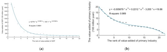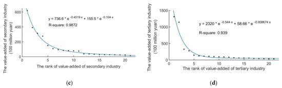 In terms of the pure values of economic growth without the geographical adjacency relations, high heterogeneities of economic growth are observed in total GDP, partial GDPs of the secondary, and tertiary industries, as shown in Figure 6. All their values-added in the descending order follow exponential functions. But, the values-added of the primary industry follow a cubic function. As for total GDP, partial GDPs of the secondary and tertiary industries, most cities’ economic growth proportions are small; while several booming cities present high economic growth proportions. A small number of top hub cities dominate the vast majority of economic growth. Furthermore, the heterogeneity degree of the tertiary industry is stronger than the secondary industry, and much stronger than total GDP.