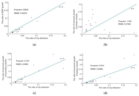 The correlation of city attraction and economic growth: (a) total GDP; (b) the primary industry; (c) the secondary industry; (d) the tertiary industry, where RMSE is root mean square error.