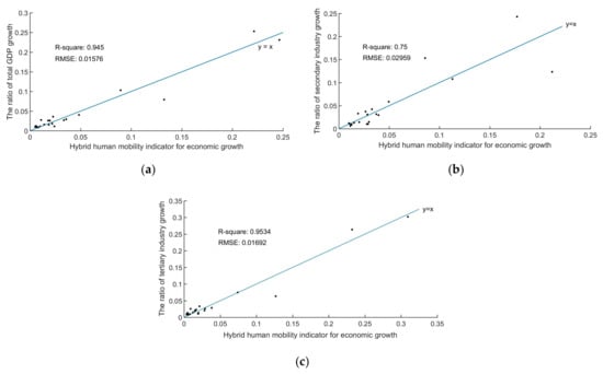The best correlation coefficients of normalized economic growth and under the fixed fitting function : (a) total GDP; (b) the secondary industry; (c) the tertiary industry, is the proposed hybrid human mobility indicator.