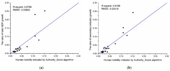 Under this context, a high-precision, cheap, simple, and near real-time way or index to estimate the economic development trend is urgently needed. In order to cut down the costs, big data techniques were presented to evaluate current economic status. For instance, Liu et al. [39] used online social activities to reflect the economic status of 282 prefecture-level cities in China, and their maximum Spearman’s rank correlation reached 0.8988. Chang et al. [40] found that the correlations (i.e., 0.9052) of online activities with the tertiary industry was larger than the secondary industry (i.e., 0.8688); and much larger than the primary industry (i.e., 0.0482). The strong relation between socio-economic status and physical human mobility were also observed [41,42]. In all, some literatures used human activities to successfully estimate economic status and demonstrated the hidden correlations of human activities and economic developments [41,42].