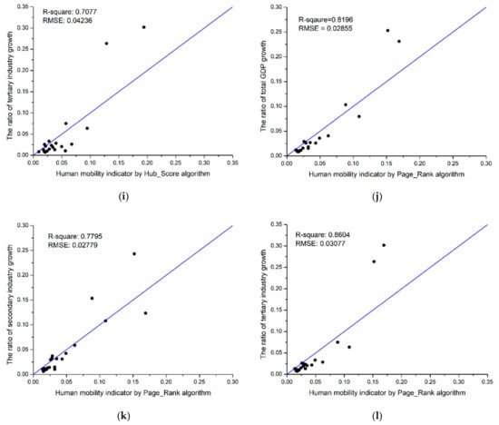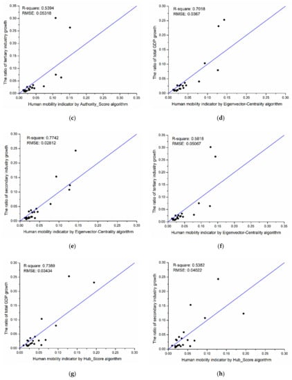 The heterogeneity degrees of human mobility and economic growth are different. The human mobility intensities are more like to follow power-law distributions; while the economic growth are exponential laws. Even though aforementioned two similarities evidently allude to the strong correlations between them, previous onefold mobility indicator [69] cannot accurately estimate economic growth. Take as an example, its correlations with the economic growths of total GDP, partial GDPs of the primary, secondary, and tertiary industries are 0.8535, −1.505, 0.7321, and 0.7814 respectively when using the fixed function to measure their correlations, as shown Figure 7. Even though these correlation coefficients are acceptable (except for the primary industry), there is still huge room to improve. Moreover, their trends are not consistent (one is power-laws and the other is exponential laws). Thus, it is necessary to integrate multifold indicators to model the relation of human mobility and economic growth.