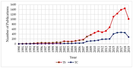 In the case of research on TC, the first article [] appears in 1990 (Figure 1). From 2000 onwards, more than 10 articles were published per year. And from 2008 on, more than 100 articles were published per year, with as many as 458 publications in 2018. Analyzing the rate of publications per month, it can be seen that it is higher in 2019 (40.28 = 282/7) than in 2018 (38.16 = 458/12).