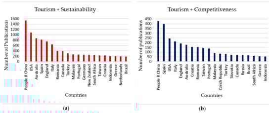 First, the analysis focused on the results in TS and TC. Significant growth was observed, which demonstrates the relevance of these issues. If we compare the average number of citations per article in TS and TC research, we see similar figures: In the case of TS, it is 8.32, and in the case of TC, it is 8.88. The three articles with the highest number of citations in TS research are Buhalis (2000) [], Gössling (2002) [] and Choi and Sirakaya (2006) []. On the other hand, the three articles with the highest number of citations in TC research are Buhalis (2000) [], Crouch and Ritchie (1999) [] Gallarza and Saura (2006) []. The most representative journals in TS and TC are Journal of Sustainable Tourism and Tourism Management, respectively. In both TS and TC research, China is shown to be the country with the most publications, accounting for 14.40% and 12.64% of total publications on these topics, respectively.