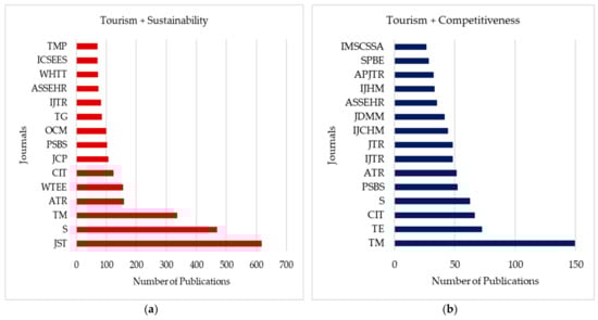 Publications in Web of Science (WoS) about TS and TC, by journal or source. Source: own elaboration based on data from WoS 2019. (a) The red bars in the first graph show the number of publications on TS research per journal; (b) the blue bars in the second graph indicate the number of publications on TC research per journal. ASSEHR: Advances in Social Science Education and Humanities Research; ATR: Annals of Tourism Research; APJTR: Asia Pacific Journal of Tourism Research; CIT: Current Issues in Tourism; IJCHM: International Journal of Contemporary Hospitality Management; IJHM: International Journal of Hospitality Management; IJTR: International Journal of Tourism Research; IMSCSSA: International Multidisciplinary Scientific Conferences on Social Sciences and Arts; ICSEES: IOP Conference Series Earth and Environmental Science; JCP: Journal of Cleaner Production; JDMM: Journal Of Destination Marketing Management; JST: Journal Of Sustainable Tourism; JTR: Journal of Travel Research; OCM: Ocean Coastal Management; PSBS: Procedia Social and Behavioral Sciences; SPBE: Springer Proceedings in Business and Economics; S: Sustainability; TE: Tourism Economics; TG: Tourism Geographies; TM: Tourism Management; TMP: Tourism Management Perspectives; WTEE: WIT Transactions on Ecology and the Environment; WHTT: Worldwide Hospitality and Tourism Themes.