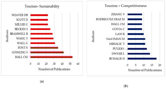 As shown in Figure 5, the authors with the most publications on TS are Hall, C.M. with 53 publications (total articles generated: 158; h-index: 31), Gössling, S. with 42 publications (total articles generated: 161; h-index: 35), and Font, X. with 35 publications (total articles generated: 65; h-index: 20), representing 0.50%, 0.39% and 0.33% of the 10,651 publications in this field, respectively.