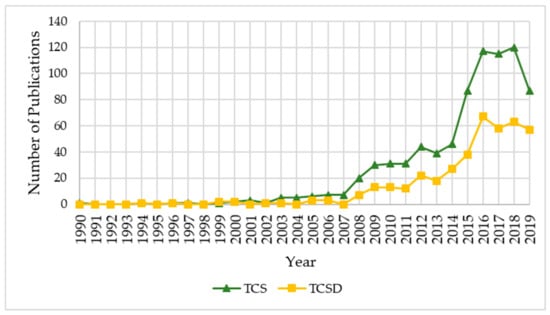 The first article related to TCS [] appears in WoS in 1990; after that year, articles appeared intermittently (not every year saw an article published). However, from 1999 onwards, articles are published every year, starting with a single article in 1999 and reaching a total of 120 in 2018 (Figure 6). Analyzing the rate of publications per month, this rate is higher in 2019 (12.42 = 87/7) than in 2018 (10 = 120/12). A growing interest in research on the subject can be observed; although the search on TCS generated only 808 results, if we determine the increase over the last 10 years (2009 to 2018), we can see that TCS has increased by more than 300%, a greater increase than the other topics analyzed (TS: 290%, TC: 278%).