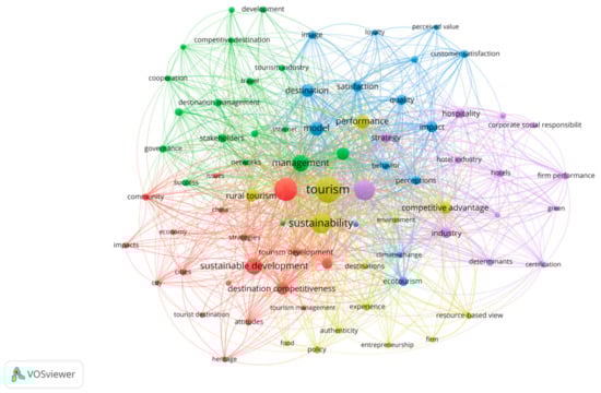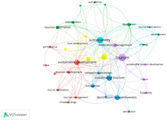 In the case of TCSD research, the analysis reveals the existence of 1158 keywords. Figure 8 shows the main keywords, which are organized into six clusters, where the most important compounds are Sustainable Development (red cluster), Destination (cluster in green), Sustainable Tourism (dark blue cluster), Competitiveness (yellow cluster), Tourism (purple cluster), and Sustainability (light blue cluster).