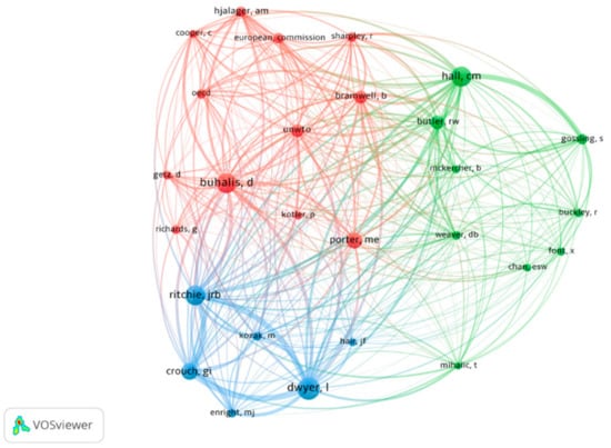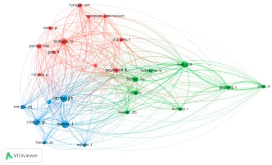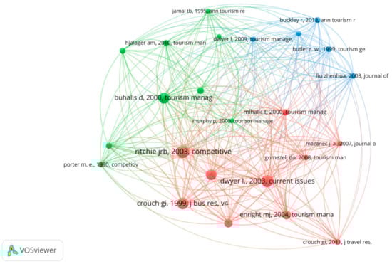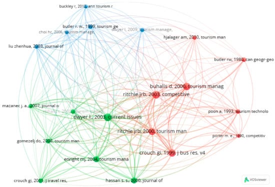 The first approach is co-citation network analysis, where every node represents an individual article and the lines indicate the collaboration relationship and the most frequent research topics relating to TCS. Figure 9 shows the leading articles on TCS in this regard. There are three clusters. In the most cited cluster (red), the paper by Ritchie J.R.B. [] has been cited 78 times. The second is by Dwyer, L. [] with 73 citations. And the third, with 71 citations, is by Crouch, G.I. []. In the second most important cluster (green), with 66 citations we find Buhalis D. [], who had the most cited paper in Table 2. Following some way below, is Barney, J. [] with 32 citations. Lastly, Liu, Z. [] leads the blue cluster with 27 citations.