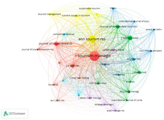 The analysis of the journal co-citation network for TCSD yields six clusters (Figure 12). The red cluster includes Tourism Management, the journal with the most citations (2022) and the highest link strength (57,900), and focuses on the planning and management of travel and tourism. The green cluster includes Journal of Sustainable Tourism (Citations 444, Link Strength 16,133), which focuses on the analysis of the relationships between tourism and sustainable development. The dark blue cluster includes International Journal of Tourism Research (Citations 179, Link Strength 7575), which focuses on tourism and hospitality research. The yellow cluster includes Annals of Tourism Research (Citations 1108, Link Strength 37,678), which focuses on academic perspectives of tourism and on the development of theoretical constructs. The purple cluster includes the Journal of Destination Marketing & Management (Citations 3819, Link Strength 112), which focuses on the study of tourism destinations related to aspects of marketing and management, placing them in specific policy, planning, economic, geographical, and historical contexts. Lastly, the light blue cluster includes Tourism Economics (Citations 89, Link Strength 2780), which focuses on the economic and commercial aspects of tourism. These journals are mainly focused on the categories of Hospitality, Leisure, Sport and Tourism, and Environmental Studies. It can also be seen that all clusters are very close to each other, indicating a strong relationship between them.