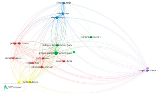 For TCSD, the bibliographic coupling of authors reveals five clusters. There is a main cluster of seven authors, followed by the second most important cluster of four authors. The leading authors are Pulido-Fernandez, J.I. with seven publications; Dwyer, L. with five; and Buffa, F. with four. Two of the clusters, which are farther away from the other three, present emerging topics of research. One is made up of Kruger, M. and Saayman, M., and the other of Dwyer, L., Armenski, T. and Mihalic, T.