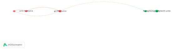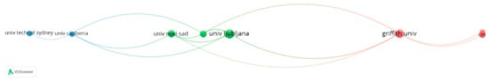 Finally, when creating the co-authorship network by institution for TCSD (Figure 20), for the universities that comply with the restriction of a minimum of three publications, it can be seen that there is little collaboration between the different universities. Indeed, from the total of 457 universities, the largest group consists of only eight universities, which are organized into three clusters. The red cluster is composed of three universities: Griffith University in Australia (6 publications, 58 citations), the College of Natural Resources (CNR) in the United States (3 publications, 11 citations) and the University of Central Florida in the United States (3 publications, 15 citations). The green cluster is composed of three universities: the University of Ljubljana in Slovenia (7 publications, 276 citations), the University of New South Wales in Australia (4 publications, 19 citations) and University of Novi Sad in Serbia (5 publications, 24 citations). The blue cluster is composed of two universities: the University of Technology Sydney in Australia (3 publications, 31 citations) and the University of Canberra in Australia (3 publications, 25 citations). The importance of Australian universities can be seen as they occupy important places in the clusters; in addition, the relationship between Australian universities is notable. Furthermore, the different clusters are fairly spaced out, which means there is relatively little collaboration between them.
