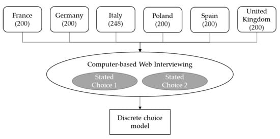 The methodology applied in this work is illustrated in a stylized manner in Figure 1. First, car owners in six European countries (France (FR), Germany (DE), Italy (IT), Poland (PL), Spain (ES) and the United Kingdom (UK)) were contacted. 1,248 of them completed the computer-based web interviewing exercise in mid-2017. The questionnaire to this survey comprised two stated choice experiments, alongside other question. The attributes and levels considered in these experiments as well as a sample of the choice set-up can be found in Rohr et al. [6]. The stated choice experiments provided information from which DCMs were estimated using ALOGIT® (see [32]).