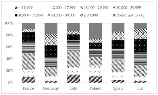 Respondents provided an estimate of their household’s combined yearly income (before tax), in the currency of their country (see Figure 2). The sample was divided into eight income range levels: ≤ €11,999, €12,000–€17,999, €18,000–€29,999, €30,000–€39,999, €40,000–€59,999, €60,000–€89,000, ≥ €90,000. Respondents were also given the option not to declare their income. This option was chosen by a sizeable proportion of Polish (27%) and German (19%) respondents. The German and UK sample illustrated a larger proportion of their respective samples with higher incomes. In contrast, Poland exhibited a tendency for income levels towards the lower end of the spectrum. Almost one-fifth of the sample, excluding Poland, reported an income level of €30,000–€39,999. Over 27% of the Italian and French respondents indicated a level of income in the €18,000–€29,999 category. Around 40% of the German and UK respondents declared an income level of €30,000–€59,999. Clusters of high-income urban dwellers and low-income rural dwellers could not be identified clearly in the samples.