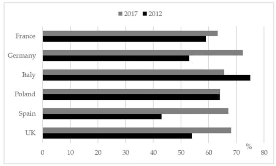 As Figure 5 also reveals, a comparison of the 2017 data with the 2012 survey findings exhibits a broad consistency in patterns across the Member States surveyed on both occasions. For France, Germany, Italy, and the UK the respondents’ views on the importance of government incentives to encourage the adoption of EVs has remained stable. In 2017, between 17% and 35% reported it as fundamental to electric car purchase. The equivalent figures in 2012 were between 16% and 34%; hence, almost the same in these four countries in both years. In contrast, both Poland and Spain reported significant increases in the number of respondents indicating incentives are fundamental. The proportion of car owners stating that incentives were bad for the market rose in all countries from 2012 to 2017.