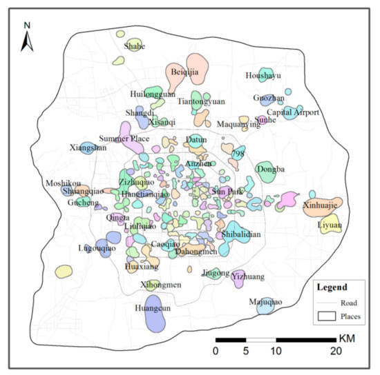 Using an appropriate spatial unit is an important role in geography research. However, there is no clear standard to select one in traditional geographical research. Some studies apply grids, traffic analysis zones (TAZs), and Voronoi polygons, all of which easily lead to discontinuities of geographic property values in a physical space. A place, as a geographical location associated with human activity, provides us with a natural geographical unit for understanding human behaviors in the urban environment because of its characteristics of scale independence and reflection of human cognition [22]. Places are extracted from the cognition of people, who consider vague boundary, land use, and semantic characteristics. The POIs from Dianping.com offer a new way to extract and model vague places. This research applied fuzzy-set theory [23] to extract place footprints based on Dianping.com data. To begin with, we measured the probability density of the place to which the POI belonged based on adaptive kernel-density estimation [24]. Secondly, we transferred the probability density to membership degree according to the relative study of the membership degree of the fuzzy function [25,26]. Finally, we modeled and extracted multiple vague places based on membership degree. The interaction between places accounts for a large proportion of the total interaction within the Sixth Ring Road. Therefore, we used the places as units. Figure 2 shows 150 places within the Sixth Ring Road of Beijing.