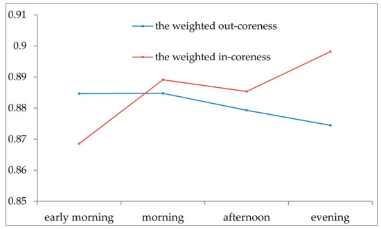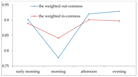 From the result the EI, we were able to obtain the distribution and change of the entropy index of nodes. Figure 3 shows that the entropy index of weighted out-coreness and weighted in-coreness was comparatively high. This means that the weighted out-coreness and the weighted in-coreness were evenly distributed. It is worth noting that the weighted in-coreness increased while the weighted out-coreness decreased during a single day. It can be seen that the difference of weighted out-coreness gradually increased, and the weighted in-coreness tended to be more balanced in the four periods on weekdays.