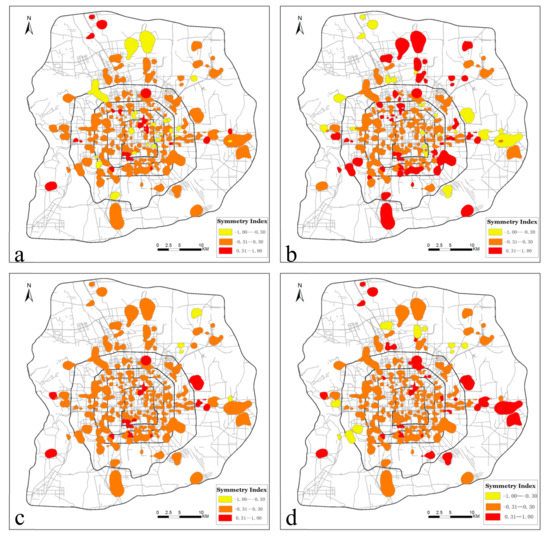 Figure 8. The spatial distribution of the symmetrical nodes on weekends. (a) Early morning; (b) morning; (c) afternoon; and (d) evening.