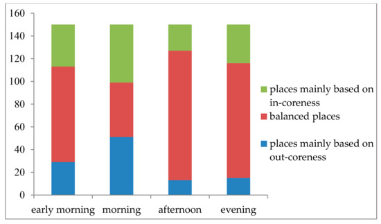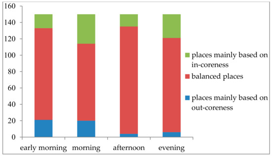 There were a large proportion of arrival places in early morning between the Fifth and Sixth Ring Roads. The places mainly covered commercial (Wangjing, Datun, Guomao, etc.) and residential districts (Zizhuqiao, Yizhuang, Huanxiang, and so on). In the morning, the arrival places that were mainly based on in-coreness gradually increased, and their spatial distribution was mostly within the Fifth Ring Road. In the afternoon, the number of arrival places dropped, mainly including 23 places, such as Maquanying and Tiantongyuan. The spatial distribution was mainly located between the Fifth and Sixth Ring Roads. The function of the places was residential. Lots of residential places (Hangtianqiao, Songjiazhaung, Yizhuang, and so on) that were mainly arrival places were found to be located between the Fifth and Sixth Ring Roads in the evening.