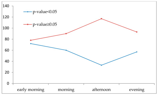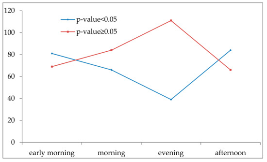 As shown in Figure 6, the results of the paired t-test show that the places where the significant probability value was less than 0.05 include Jianguomen-Beijing Railway Station, Beijing Capital International Airport, and Sanlitun, accounting for 54% of the total places in the early morning. The in-flows and out-flows of those places had an obvious tendency. In the morning, there were 66 places, accounting for 44% of the total places, for which the significant probability value was less than 0.05, such as Beijing Capital International Airport, Fuxingmen, Xidan, and Chaowaidajie. Most places in the morning were not different in direction heterogeneity. In the afternoon, the number of places with a significance probability value less than 0.05 continuously decreased, accounting for only 26% of total places. However, there were 88 places identified that had significant difference in flow direction because of their value of significant probability, which was less than 0.05. The interesting thing is that there were constant places that were responsible for 11% of the total places which were heterogeneous from the direction dimension perspective in four periods on weekdays. In conclusion, lots of places were found to have significant direction heterogeneity in the early morning and evening, while there was no obvious difference in the morning and afternoon.