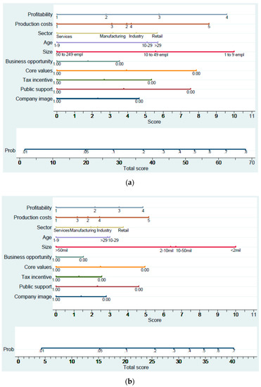 Next, the influence of drivers for CER was estimated. To estimate the environmental attitude of SMEs and to identify their determinant motivations and characteristics for their engagement in CER, we used binary logistic regression. A nomogram could be built in order to display the effect size of the influence of the CER explanatory factors. When using the binary logistic model, we estimated a logit equation, which is a linear function that models the logarithm of the probability of having the response, Y = 1, to the predetermined baseline category, Y = 0 [50].