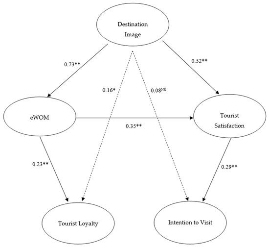 Further, this study also exposed that eWOM has a partial mediation effect on the destination image–tourist loyalty relationship, and both eWOM and tourist satisfaction fully mediate the association amid destination image and intention to visit [108]. So, testing the above associations through multiple mediators is a relatively novel idea. Tourists’ well-satisfied feelings and experiences toward destination image encourage their intention to visit the destination [60]. These datasets identified a constructive association among eWOM, tourist satisfaction and tourist loyalty, and intention to visit [109]. Tourists with greater satisfaction of the services quality, self-determination, and customer values are happier and loyal to intention to visit with the destinations [33].