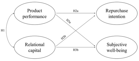 Figure 1 exhibits the conceptual model of this study, presenting the relationships among the four constructs, namely, product performance, relational capital, repurchase intention, and subjective well-being, and the hypotheses that will be tested.