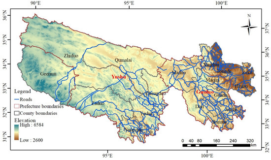 The TRHR is located in the southern part of Qinghai Province, with an area of 363,000 km2, accounting for 50.3% of the total land area of Qinghai Province. Its administrative regions include Maduo, Malang, Dari, Gande, Jiuzhi, Banma, Zhiduo, Zaduo, Zhiduo, Qumalai, Nangqian, Yushu, Xinghai, Tongde, Zeku, Henan, and Tanggula (Figure 1). The TRHR is dominated by glaciers, periglaciers, mountains, highland plains, and hilly landforms. The elevation is between 2600 m and 6584 m, and the topography is higher in the west and lower in the east. The TRHR has a grassland area of 271,000 km2, accounting for 69.70% of the total area. It also has a desert area of 5.8 million km2, accounting for 14.80% of the total area, and a water body and wetland area of 1.60 million km2, accounting for 4.20% of the total area. The grassland categories are sequenced from alpine meadows, warm grasslands, alpine grasslands, and alpine deserts from southeast to northwest, with its productivity decreasing accordingly [27,28]. The TRHR is located in an alpine zone on the northeastern edge of the Qinghai–Tibet Plateau. Due to the unique geographical environment and climatic conditions of the plateau, the frequent occurrence of snow disasters in winter and spring has a serious impact on local livestock production. Snow disasters were reported 756 times by 50 meteorological stations in Qinghai Province from 1961 to 2017: 486 mild disasters, 169 moderate disasters, 77 serious disasters, and 24 severe disasters [4].