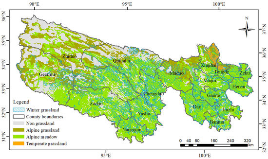Spatial distribution of grass types and winter grassland boundaries in the TRHR.