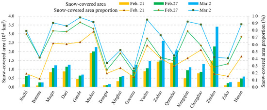 On all three days, the snow depth of the whole area was mainly below 10 cm, with 120,800 km2, 159,300 km2, and 209,600 km2 of snow-covered areas on 21 February, 27 February, and 02 March 2019, respectively. This in proportion to the total area was 33.78%, 44.55% and 58.6%, respectively. Accumulations of 5~10 cm and 10~15 cm were mainly distributed in the areas of Yushu, the southern part of the Nangqin, the majority of Maduo, the western part of Maqin, the western part of Dari, and the northwest of Gande.