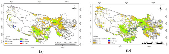 According to the Meteorological Disaster Standard of the Qinghai Provincial Technical Supervision Bureau, the grades of pastoral-area snow disasters, and the winter grassland canopy height in the TRHR, we classified the snow depth data in TRHR on 21 February, 27 February, and 02 March 2019 into five grades: 0~2 cm, 2~5 cm, 5~10 cm, 10~15 cm, and >15 cm [30,31].
