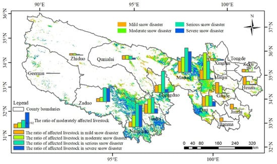 According to the snow disaster level distribution map and the livestock density of the counties in the TRHR, we calculated the number of SUs affected by the four grades of snow disasters in each administrative region (Figure 5). Indeed, the central and eastern areas of the TRHR, where the snow disaster occurred in concentrated areas, are important grasslands for animal husbandry in Qinghai.