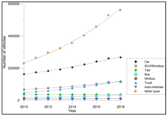 Growth trends of total numbers of registered vehicles in Dhaka (2010–2018) (data source: the Bangladesh Road Transport Authority (BRTA) 2018) [20].