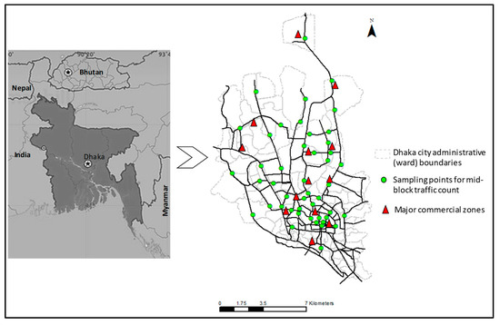 Dhaka, the capital, is situated in the central part of Bangladesh (Figure 2). It represents a typical megacity in a developing country, where the centralization of facilities is the key reason for a very high population. The city provides space for everything, including residential areas, commercial areas and industries. The road network is quite widespread, with some major arterial roads connecting the city (Figure 2). Dhaka’s city structure is very much mixed in nature, and very few places are dedicated solely for any specific use. However, there are some commercially dominant zones in the city that influence the flow of traffic. The points on the map in Figure 2 are indicative of the positions of those commercial zones, which are in fact more dispersed than the areas indicate. Besides, the volume and characteristics of vehicles on roads differ based on the functionality of different zones. For instance, despite being a commercial zone, old Dhaka (the southern portion of the map) is mainly dominated by different businesses and street markets on narrow roads: nonmotorized rickshaws pull carts, and similar nonmotorized conveyances dominate the traffic flow.
