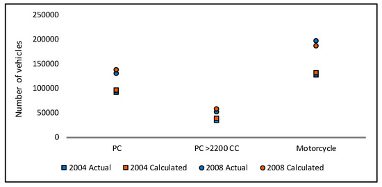The traffic data for 2024 scenarios, considering the future transport plans of the city, were projected based on the growth trends depicted in Figure 1. Over the years, the growth pattern of vehicles varies during different periods, aligning with policies or socioeconomic factors. However, this study considered the 8-year growth trend for different vehicle categories, which may justify trends in the future. In order to validate the outcome of the vehicle growth trends (Figure 1), this study estimated data for previous years (2004 and 2008) and compared those to known traffic volumes from those years. In Figure 4, the monitoring data are depicted as “actual” data, and values estimated by the trend are “calculated” data. A comparison of the results to the actual data showed that in the maximum number of cases, the calculations overestimated the values. The comparison in Figure 4 was done for private vehicles and motorcycles only, as these vehicles showed rapid growth over the years. Since the difference was insignificant, the projection method was therefore considered to be legitimate and conservative.