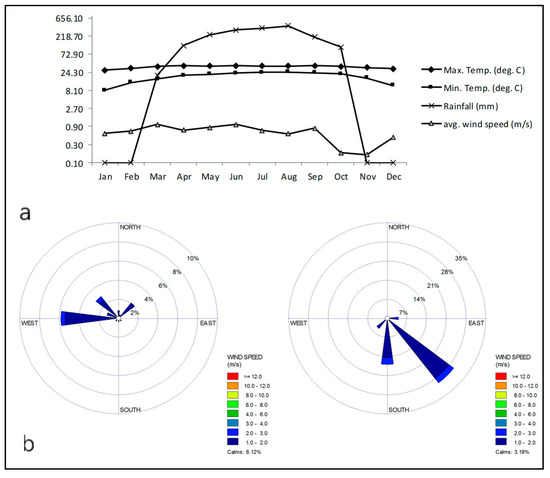 Figure 5. (a) Average monthly meteorological data for Dhaka City in Bangladesh; (b) wind direction map for November (left) and July (right) (data source: Bangladesh Meteorological Department (BMD) [26]). - ○