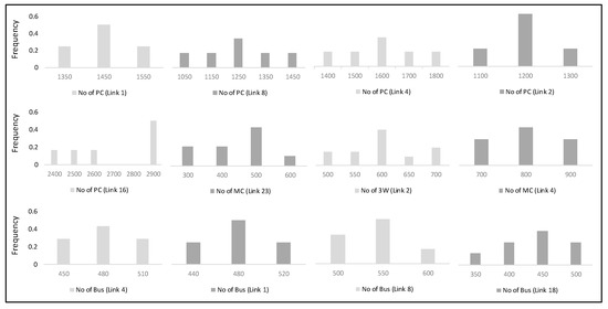 In order to assess the nature of the probability distribution, it was important to identify how the input parameters (traffic volume) were distributed. Analysing the histograms of the field sample data, the traffic volumes were assumed to be normally distributed in most of the cases, although some of the samples showed a slightly skewed distribution. As an example, the distributions for different road links are shown in Figure 6 below.