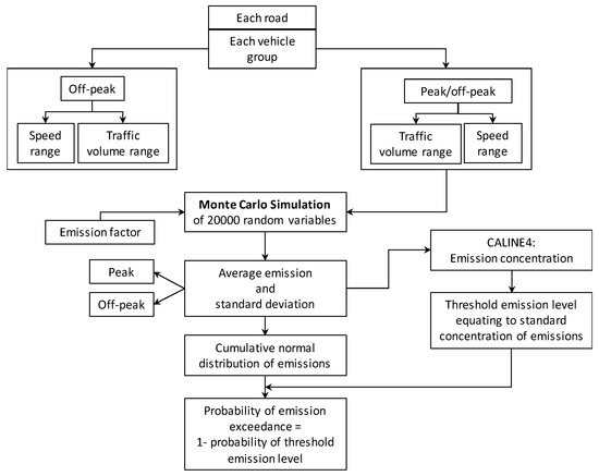 A mesoscale emissions modelling approach for line sources considers the factors that influence emissions by identifying the characteristics of vehicle fleets for a zone or area. Identifying fleet characteristics and their operating patterns thus becomes important in this approach. However, there is room for uncertainty in characterization through surveys, as this assumes a scenario for a period based on a limited number of surveys. A Monte Carlo simulation technique can reduce the extent of that uncertainty [17,18] through an analysis of thousands of scenarios within the range that is identified in the survey. Thus, a Monte Carlo simulation was used in this research to randomly generate thousands of scenarios that considered the highest and lowest values of traffic volume and speed profiles for each road link. Each dataset included two peak periods and an offpeak period of the day to cover the diurnal variation at each road link. The other factors that affect the rate of emissions, such as vehicle technology, fuel type and air conditioner usage patterns, were kept constant for all the simulations. The research also identified the extent of variation in emissions from probabilistic and non-probabilistic approaches, thus justifying the importance of such analyses in emissions modelling. This research aimed to assess the probability of health risks that might define the urban health status of the city, therefore indicating urban sustainability for present and future scenarios.
